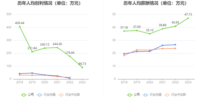 截至2023年末,公司员工总数为463人,人均创收552.69万元,人均创利89.73万元,人均薪酬47.15万元,较上年同期分别变化-71.09%、-49.21%、15.15%。