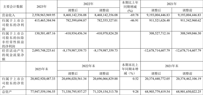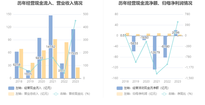 2023年,公司经营活动现金流净额为20.96亿元,同比增加102.76亿元;筹资活动现金流净额14.90亿元,同比减少32.21亿元;投资活动现金流净额-4.13亿元,上年同期为33.33亿元。