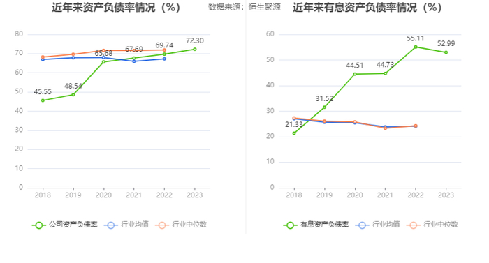 在偿债能力方面,公司2023年年末资产负债率为72.30%,相比上年末上升2.56个百分点;有息资产负债率为52.99%,相比上年末下降2.12个百分点。