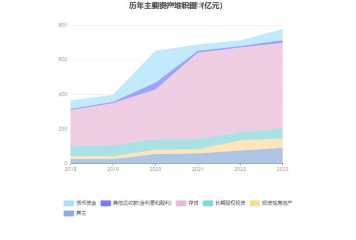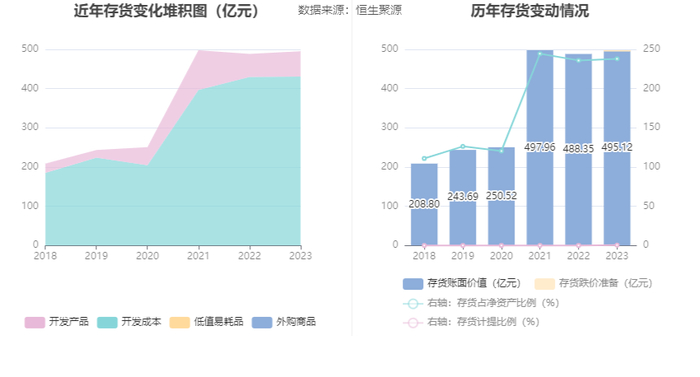 从存货变动来看,截至2023年年末,公司存货账面价值为495.12亿元,占净资产的238.0%。其中,存货跌价准备为2.08亿元,计提比例为0.42%。