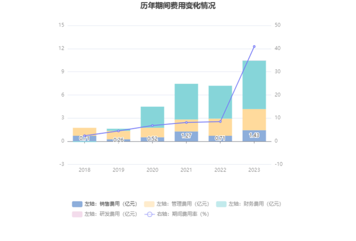 2023年,公司期间费用为10.47亿元,较上年同期增加3.28亿元;期间费用率为40.92%,较上年同期上升32.43个百分点。其中,销售费用同比增长101.72%,管理费用同比增长23.7%,研发费用为333.35万元,财务费用同比增长47.06%。
