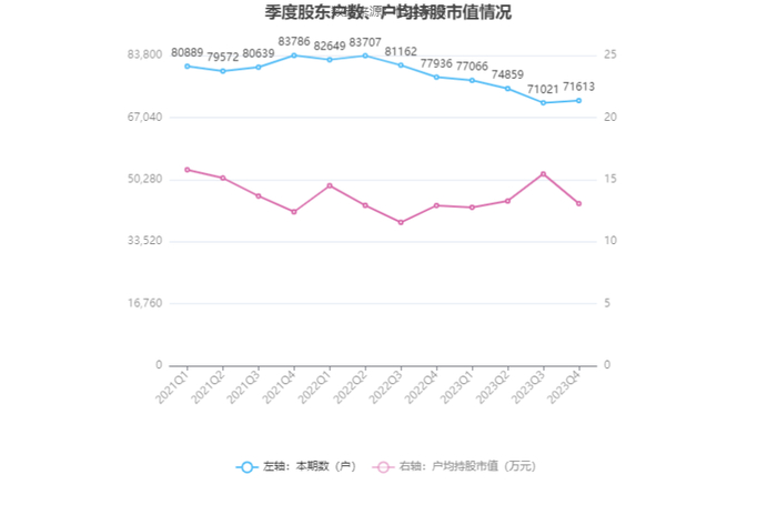 筹码集中度方面,截至2023年年末,公司股东总户数为7.16万户,较三季度末增长了592户,增幅0.83%;户均持股市值由三季度末的15.46万元下降至13.07万元,降幅为15.46%。