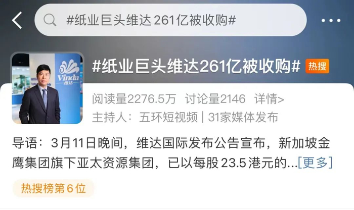 今天早上,#纸业巨头维达261亿被收购#的词条登上热搜,不少网友直呼:最爱的老字号也被偷家了,再也不买维达了。