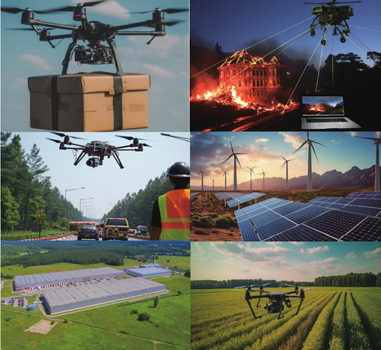 快递物流、地理测绘、城市管理、应急救援、能源巡检、交通巡检、农林保植、载人无人机。