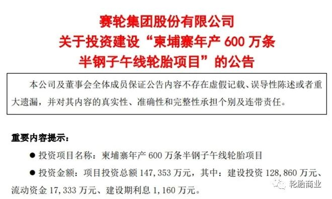 2023年10月30日,赛轮集团股份有限公司发布《关于投资建设“柬埔寨年产 600 万条半钢子午线轮胎项目”的公告》。公告显示:项目投资总额 147,353 万元,其中:建设投资 128,860 万元、流动资金 17,333 万元、建设期利息 1,160 万元。