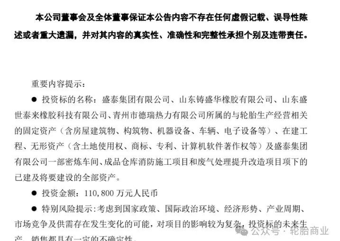 本次投资标的为盛泰集团有限公司、山东铸盛华橡胶有限公司、山东盛世泰来橡胶科技有限公司、青州市德瑞热力有限公司所属的与轮胎生产经营相关的固定资产(含房屋建筑物、构筑物、机器设备、车辆、电子设备等)、在建工程、无形资产(含土地使用权、商标、专利、计算机软件著作权等)及盛泰集团有限公司一部密炼车间、成品仓库消防施工项目和废气处理提升改造项目项下的已建及将要建设的全部资产。
