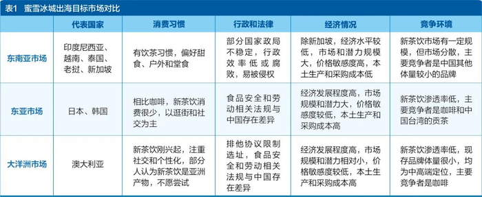 在海外市场进入顺序选择上,蜜雪冰城遵循了循序渐进的原则(见图2),根据与中国文化、经济和体制等各方面差距进行综合考虑,先从各方面与中国较为类似的东南亚市场着手,再进入文化和消费习惯比较相近但经济发展程度较高的日韩市场,最后挑战与中国各方面差距较大的大洋洲市场(见表1)。