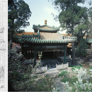 乾隆花园,也称宁寿宫花园,与御花园、慈宁宫花园、建福宫花园并称紫禁城四大花园。花园的修建与宁寿宫区域同步,始于乾隆三十七年(1772),落成于乾隆四十一年(1776)。花园构思巧妙,在南北长168米、东西宽38米的狭长地块上,划分出四进院落,由叠石曲径、参天古木和亭台楼阁共同构成幽深隐逸的园林景观,显示出高超的造园艺术。禊赏亭就位于第一进院落西侧,是步入乾隆花园后目力所及的第一座建筑。(图1)