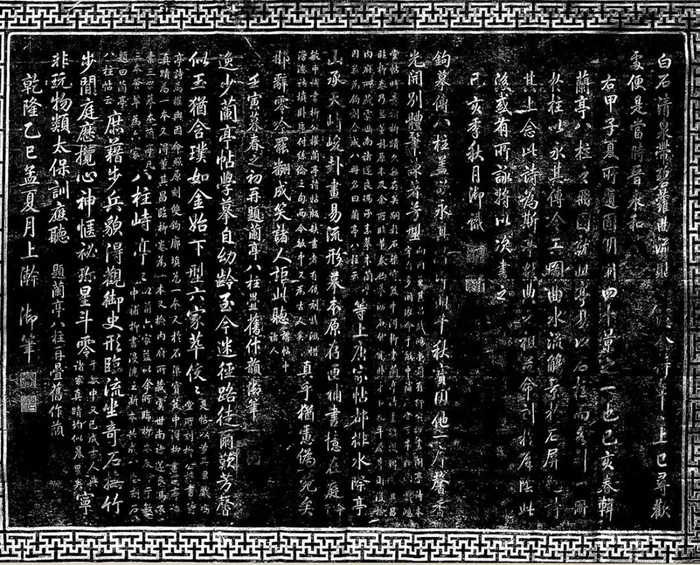 综合以上推测,禊赏亭内所设兰亭石屏的形式也应一面为“图”、一面为“记”,图的内容很可能即贾全所刻《兰亭记图》,记的内容则可确定为“兰亭八柱”之八的“弘历临董其昌临柳公权书兰亭诗”。