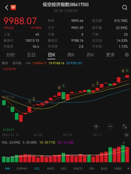今年一季度,低空经济相关概念板块行情火爆,多只概念股占据牛股席位。政策也在持续发力,就在3月28日,工信部等四部门联合发布《通用航空装备创新应用实施方案(2024-2030年)》,低空经济概念再度点燃资本市场,A股多只低空经济概念股连续涨停,多股甚至涨超40%。