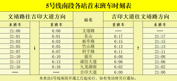 为满足5号线南段乘客早、晚高峰通勤需求,同时为5号线南北两段割接测试工作预留充足的夜间施工时间,以早日实现5号线全线开通,5号线南段开通初期运营后,运营服务时间暂定为6:00-21:00。首班车于6:00自吉印大道站、文靖路站两端对发,末班车于21:00自吉印大道站、文靖路站两端对发。开通后,线路采用吉印大道站至文靖路站的单一交路方式运行。