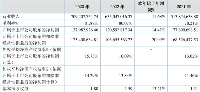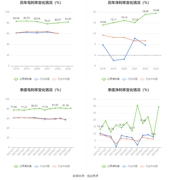 2023年,公司毛利率为81.87%,同比上升1.80个百分点;净利率为19.46%,较上年同期上升0.47个百分点。从单季度指标来看,2023年第四季度公司毛利率为81.71%,同比上升1.00个百分点,环比上升0.35个百分点;净利率为29.51%,较上年同期下降1.11个百分点,较上一季度上升21.89个百分点。