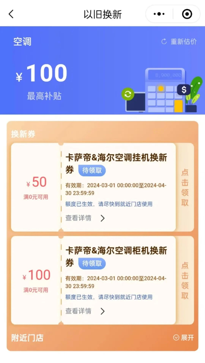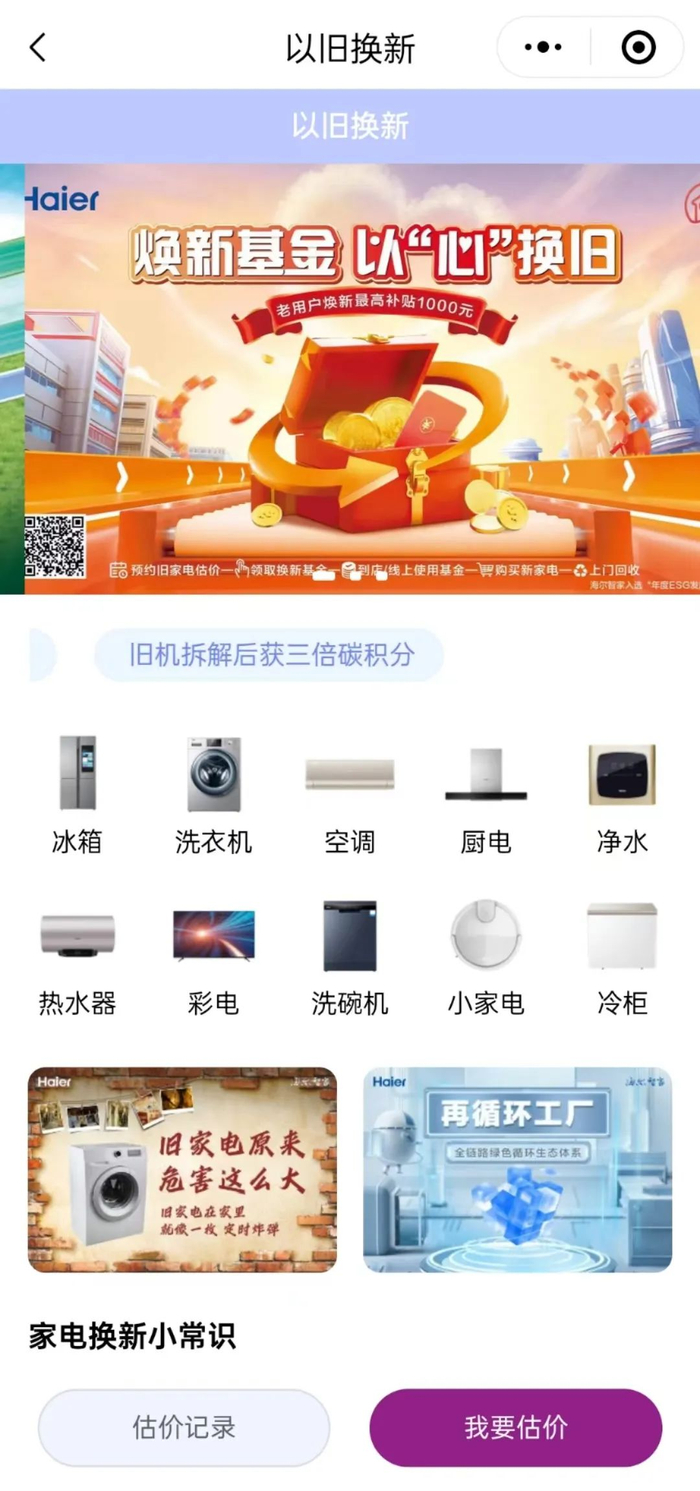 消费者可对旧家电进行估值,最高可获1000元折旧券,该券到线下海尔专卖店店核销使用。旧机评估可通过“海尔空调”微信公众号、海尔智家App或门店咨询等渠道参与并领券。