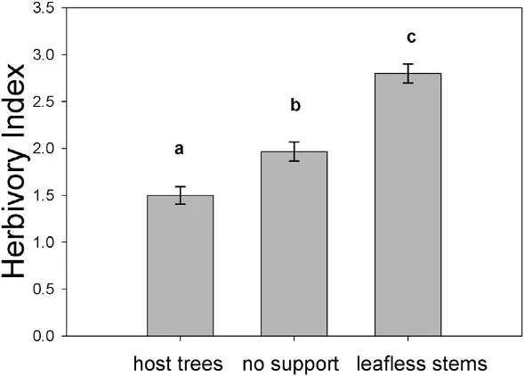 科学家发现,通过“造假”,避役藤是能降低被捕食的风险的。相较于未搭上宿主或者未拟态的个体,与宿主叶片融为一体的个体被捕食的风险明显更低。因为避役藤的叶片密度一般会比宿主低,通过“造假”暗度陈仓,融入宿主之中后,哪怕宿主遭到了捕食,风险更大的也是宿主。