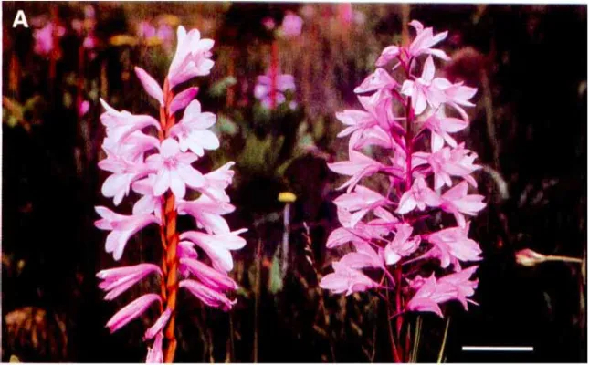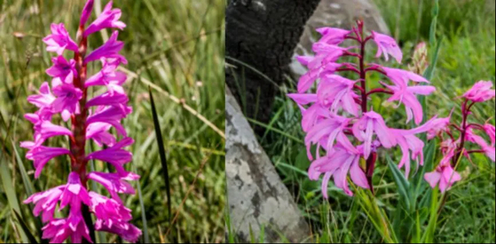 左边是正主,属于鸢尾科的喇叭兰属植物 Watsonia lepida。右边则是它的“高仿号”——兰科迪萨属的成员 Disa pulchra。