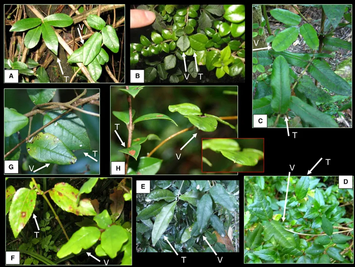 但是避役藤的“造假”能力就是这么高超。科学家用 11 个叶片性状来比对避役藤与宿主的相似性,发现两者在叶片角度、叶片大小、叶柄长度与叶片颜色等 9 个性状上,都十分相似。可以说,避役藤在叶片的各个维度上都做到了十足的模拟,夹杂在宿主叶片中,达到了粗看一眼真假难辨的地步。