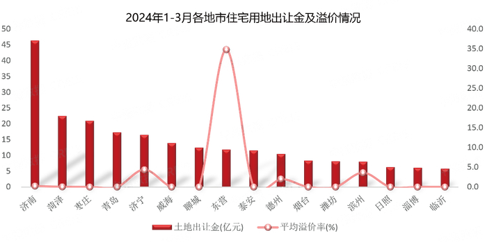 2024年1-3月山东省宅地出让金收入较去年同期正增长。分城市方面,济南市居首,宅地出让金为46.4亿元;菏泽市排在第二位,出让金为22.5亿元;枣庄市位列第三,出让金为21亿元。东营总体溢价率最高,达34.8%。