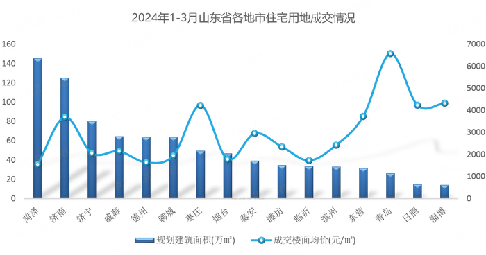 2024年1-3月山东各地市成交宅地168宗,规划建面868.6万㎡,同比下降14.1%,土地成交面积同比缩量但地块数量增加;3月份单月成交量和楼面均价均有所回升。1-3月成交楼面均价约为2612元/㎡,同比上涨38.5%。