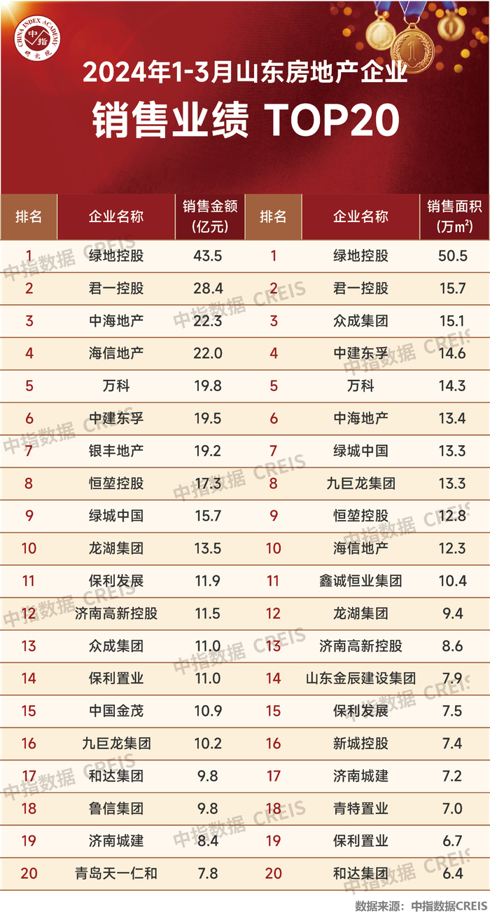 特别声明:房地产企业销售数据统计是以2024年1-3月期间销售的商品房为统计口径,主要依据中指数据CREIS(点击查看)在山东的销售监测数据。本榜单仅供参考,不保证数据的准确性、完整性及可靠性,不对使用榜单及内容所引发的任何直接或间接损失承担责任。