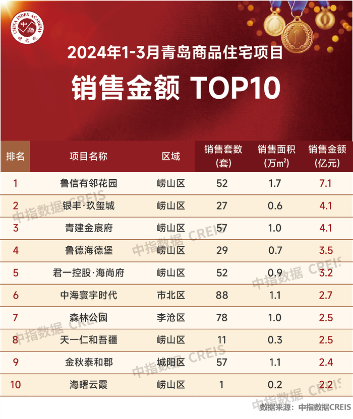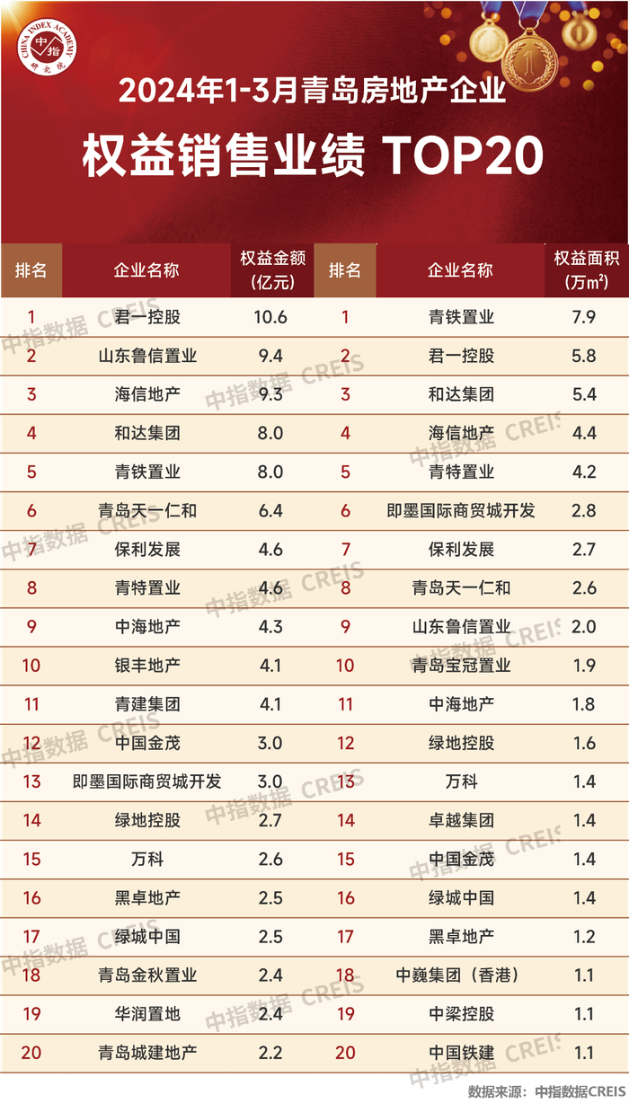 特别声明:房地产企业销售数据统计是以2024年1-3月期间销售的商品房为统计口径,主要依据中指数据CREIS(点击查看)在青岛的销售监测数据,并同时参考企业提供的相关数据,对少数没有在监测范围内的项目,由企业提供相关文件,经审核,也纳入统计范围。本报告仅供参考,不对使用报告及其内容所引发的任何直接或间接损失承担责任。