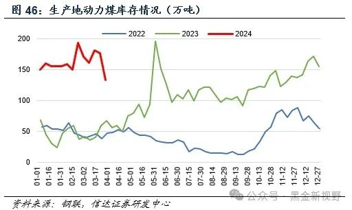 ⚫产地库存:截至3月29日,生产地炼焦煤库存较上周增加23.8万吨至266.8万吨,周环比增加9.80%。