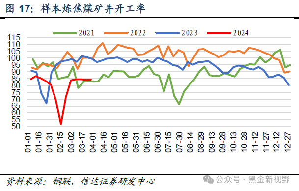⚫截至3月29日,样本炼焦煤矿井开工率为84.32%,周环比增加0.1个百分点。