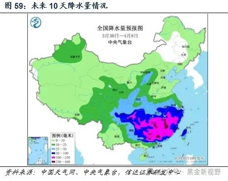 ⚫ 未来11-14天((4月8-11日),江南、华南北部及贵州东部等地累计降水量有30~50毫米,江南南部及华南北部等地部分地区60~90毫米:新疆西北部、西北地区东南部及东北地区东部等地有5~15毫米;上述大部分地区降水量较常年同期偏多3~7成,局地偏多1倍以上。