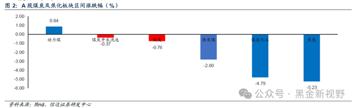 ⚫本周煤炭开采洗选板块下跌0.37%,动力煤板块上涨0.84%,炼焦煤板块下跌2.80%;焦炭板块下跌5.23%,煤炭化工下跌4.79%。