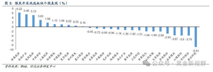 ⚫本周煤炭采选板块中涨幅前三的分别为新集能源(6.22%)、金瑞矿业(5.46%)、电投能源(5.13%)。