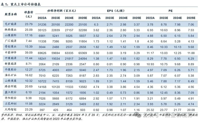 我们认为,当前正处在煤炭经济新一轮周期上行的初期,基本面、政策面共振,现阶段逢低配置煤炭板块正当时。供给方面,晋陕蒙产地产能利用率周环比小幅下降1.1个百分点,尤其山西地区受“三超”专项整治行动,产能利用率下降明显,我们预计3月国内原煤产量仍呈下降趋势。需求方面,沿海八省电煤日耗延续下降态势(较上周下降3.40万吨/日,周环比下降1.79%),内陆十七省电煤日耗止跌反弹(日耗较上周上升7.80万吨/日,周环比增加2.42%)。非电需求方面,化工周度耗煤环比提升,维持高位(较上周上升3.33万吨/日,周环比增加0.55百分点);随着上周钢材价格阶段性反弹,部分低库存焦企适当补库原料煤,黑色市场情绪有所改善。价格方面,本周港口动力煤和焦煤价格小幅下跌但价格降幅收窄(截至3月29日,秦皇岛港动力煤(Q5500)山西产市场价830.0元/吨,周环比下跌10.0元/吨;京唐港山西产主焦煤库提价(含税)1950.0元/吨,周环比下跌50.0元/吨),但部分产地价格呈现企稳止跌且小幅探涨态势。值得关注的是,据印度平台公司BigMint数据显示,印度2024财年(2023年4月—2024年3月)冶金煤进口量预计将从2023财年的6910万吨增加至7230万吨,同比增长约5%;预计到2025年冶金煤进口量可能会增加7600万吨左右;到2030年,印度冶金煤需求可能在2.1亿吨-2.2亿吨之间。整体上,随着下游复工复产向好尤其是停缓建基建项目的复工,非电需求有望逐步改善,叠加安全监管持续约束下国内煤炭供给收缩(24年1-2月,全国原煤产量同比下降4.2%)和海外煤价持续维持高位或引发的进口煤减量,特别是现货量紧张和库存并未明显垒库甚至焦煤库存处于同期相对较低水平,且大秦线开启检修,我们预计短期煤价企稳止跌或呈小幅震荡,而一旦需求边际改善,价格具有较大向上弹性,焦煤价格或率先反弹。与此同时,我们认为,煤炭供需两端供给最为关键,供给无弹性而需求有弹性,主要矛盾在于需求能否兑现明显复苏。当前要客观看待煤价淡旺季的正常波动,无需过度在意短期价格回调,更应该关注全年价格中枢仍处于相对较高水平,进而决定着优质煤炭企业仍有望保持较高ROE水平。总体上,能源大通胀背景下,我们认为未来3-5年煤炭供需偏紧的格局仍未改变,优质煤炭企业依然具有高壁垒、高现金、高分红、高股息的属性,叠加煤价筑底推动板块估值重塑,板块投资攻守兼备且具有高性价比,短期板块回调后已凸显出较高的投资价值,再度建议重点把握现阶段煤炭的配置机遇。