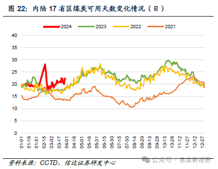 ⚫内陆17省:截至3月28日,内陆十七省煤炭库存较上周上升55.70万吨,周环比增加0.76%;日耗较上周上升7.80万吨/日,周环比增加2.42%;可用天数较上周下降0.30天。