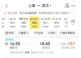 每年航班换季前后,机票价格都相对较低。在去哪儿平台上,3月底北京飞往海口、西安、三亚、哈尔滨,上海飞往长沙、南昌、济南,广州飞往上海、南京、厦门,成都飞往长沙、丽江,杭州飞往昆明、北京,昆明飞往成都、珠海,武汉飞往南宁、宁波等,机票价格均在300元以下(不含机建燃油费用),低于高铁价格。例如4月5日,上海飞武汉机票低至157元,而同天高铁票价最低为312元。