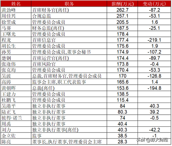 最高是原首席财务官黄劲峰,薪酬大约263万元,减少87万元。合规总监周佳兴,薪酬257万元,减少53万元,管委会成员徐翌成大约206万元,增加1.6万元。这三个高层薪酬超过200万元。
