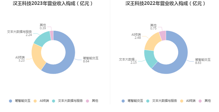 分产品来看,2023年公司主营业务中,笔智能交互收入8.64亿元,同比增长0.18%,占营业收入的59.58%;AI终端收入3.23亿元,同比增长30.36%,占营业收入的22.27%;文本大数据与服务收入2.24亿元,同比增长4.30%,占营业收入的15.44%。