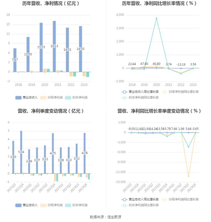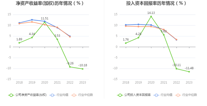 数据显示,2023年公司加权平均净资产收益率为-10.18%,较上年同期下降0.92个百分点;公司2023年投入资本回报率为-11.48%,较上年同期下降1.37个百分点。