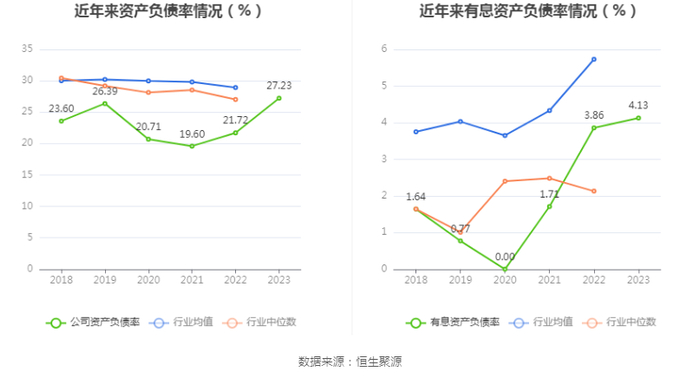 在偿债能力方面,公司2023年年末资产负债率为27.23%,相比上年末上升5.51个百分点;有息资产负债率为4.13%,相比上年末上升0.27个百分点。