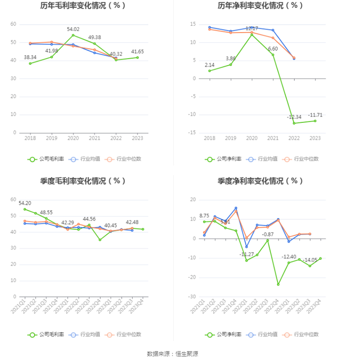 2023年,公司毛利率为41.65%,同比上升1.33个百分点;净利率为-11.71%,较上年同期上升0.63个百分点。从单季度指标来看,2023年第四季度公司毛利率为41.89%,同比上升6.61个百分点,环比下降0.59个百分点;净利率为-10.19%,较上年同期上升13.43个百分点,较上一季度上升3.86个百分点。