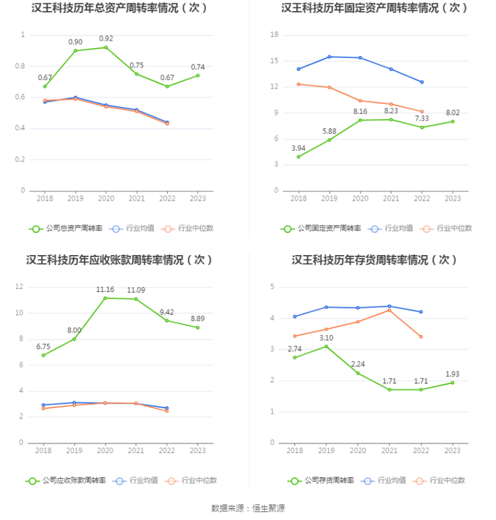 营运能力方面,2023年,公司公司总资产周转率为0.74次,上年同期为0.67次(2022年行业平均值为0.44次,公司位居同行业26/103);固定资产周转率为8.02次,上年同期为7.33次(2022年行业平均值为12.57次,公司位居同行业59/103);公司应收账款周转率、存货周转率分别为8.89次、1.93次。