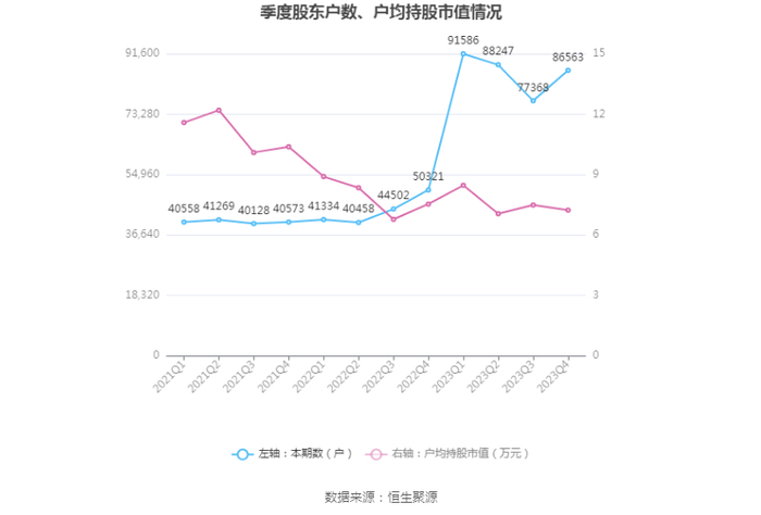 筹码集中度方面,截至2023年年末,公司股东总户数为8.66万户,较三季度末增长了9195户,增幅11.88%;户均持股市值由三季度末的7.49万元下降至7.24万元,降幅为3.34%。