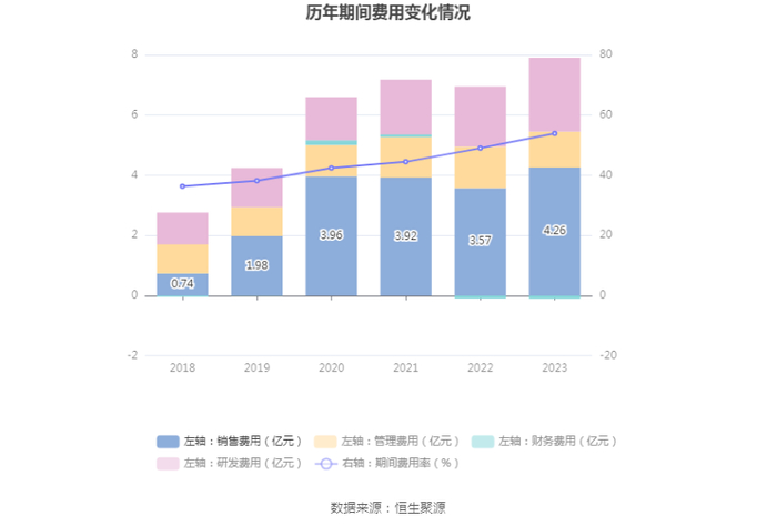 2023年,公司期间费用为7.82亿元,较上年同期增加9536.05万元;期间费用率为53.90%,较上年同期上升4.89个百分点。其中,销售费用同比增长19.46%,管理费用同比下降13.79%,研发费用同比增长23.21%,财务费用由去年同期的-856.15万元变为-987.97万元。