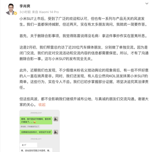 3月31日,小米汽车副总裁@李肖爽发文回应近期风波:“小米SU7上市后,受到了广泛的欢迎和认可,但也有一系列与产品无关的风波发生。我们一直都保持缄默,但近两天,实在有太多朋友询问,我就统一简要作答。