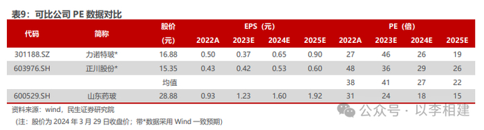 公司是国内药用玻璃的龙头,上市公司中同样主营药用玻璃业务的可比公司有力诺特玻和正川股份。以2024年3月29日收盘价为基准,可比公司2023-2025年PE均值分别为41x、27x、22x,公司对应PE分别为24x、18x、15x,低于可比公司均值。