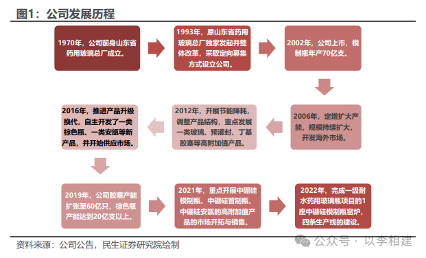 公司前身为1970年成立的山东省药用玻璃总厂,1993年完成股改,2002年于上交所上市,总部位于山东省淄博市沂源县,主要从事各种药用玻璃瓶产品的研发、生产和销售,产品主要应用于各类药品、保健品、化妆品等,是国内最大的模制瓶生产厂家。