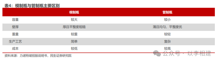 药用玻璃根据制造工艺及用途可分为模制瓶、管制瓶两类。模制瓶生产时无需制作玻管,通过模具直接将玻璃液制成药瓶;管制瓶生产时需先将玻璃液制成玻管,然后切割玻管二次加工制得一定形状和体积的药瓶,即管制瓶生产过程可分为拉管和制瓶两个环节。模制瓶与管制瓶的区别主要在容量、壁厚、重量、生产工艺、成本等方面。