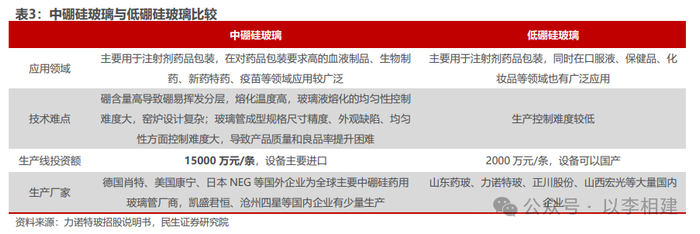 中硼硅玻璃性能最适合药用,但国内应用仍以低硼硅为主。l中硼硅玻璃指B2O3含量在8%-12%、平均线热膨胀系数为5.0×10-6K-1的药用玻璃,也被称为5.0玻璃,由德国肖特发明,因其优异的抗热冲击性能及耐水性能在国际上大量使用;
