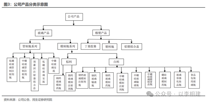公司的主要产品为药用玻璃,包括:模制瓶、棕色瓶、安瓿瓶、管制瓶、丁基胶塞、铝塑盖塑料瓶等6大系列、千余种规格,能为制药企业全套提供“瓶+塞+盖”药包材服务。其中,模制瓶产品为公司核心收入来源,2022年公司模制瓶产品(模制瓶+棕色瓶)贡献62.5%的收入,管制瓶产品(管瓶+安瓶)收入占比5.5%,橡塑产品(丁基胶塞+铝塑盖塑料瓶)占比6.8%。