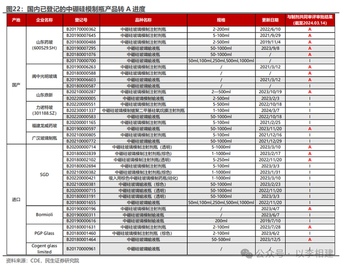 药包材产品在CDE(国家药品监督管理局药品审评中心)的登记办理流程为“产品研发定型——生产三批次产品——稳定性、相容性和安全性研究——药监总局网上登记——现场提交资料——取得登记号——与药品关联审评——与制剂共同审评审批结果由I变成A”(I 代表尚未通过与制剂共同审评审批的原料/辅料/包材,A 代表已批准在上市制剂使用的原料/辅料/包材)。我们梳理国内市场已登记的中硼硅模制瓶产品转A进度如下: