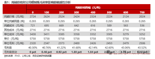 根据测算结果,纯碱价格每下降100元,公司模制瓶的毛利率可以提升0.46pct。