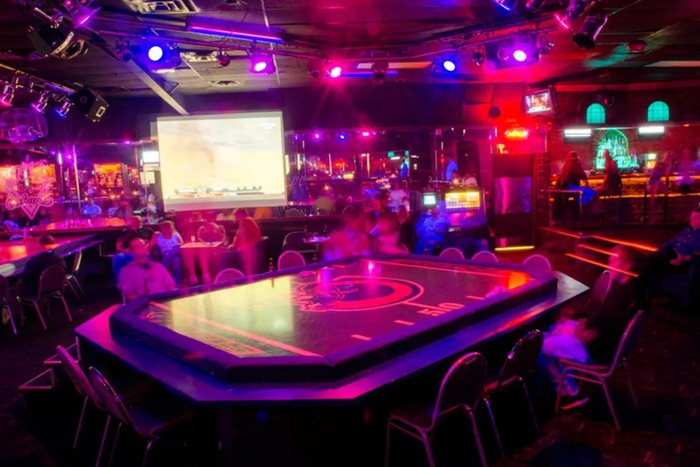 进去了以后,我们看见舞台边的沙发上坐着一个老大爷,一个年轻一点的妹妹在他身上扭来扭曲。隔壁有两个小帅哥抓着一根钢管跳舞,他们的皮衣很紧,勾勒出胯部明显的凸起物。