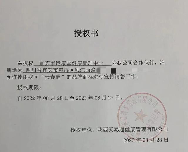 她称,她在2022年四五月间从网上看到信息,并去陕西总店学习后,签协议投入5万元加盟“天泰通耳健康中心”和购买产品。但目前她无法提供加盟协议,《授权书》显示,2022年8月28日,陕西天泰通健康管理有限公司授权宜宾市运康堂健康管理中心(以下简称运康堂)为公司合作伙伴,允许其使用公司“天泰通”品牌商标进行宣传销售,期限一年。